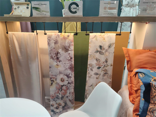 此屆法蘭克福家紡展,華紡股份家紡分公司打造了以“Green world”為主題,以綠色環保可持續的特色纖維產品為主材質,研發了醋酸系列/真橙系列/木棉系列/絲質系列/超柔系列/麻系列六大系列產品,從材質、功能、膚感、科技、花型、款式等多方面對產品進行了融合升級,吸引了來自法國、意大利、葡萄牙等諸多國家的客戶進入展位進行咨詢洽談!其中,迎合歐洲市場喜好的亞麻、漢麻提花、色織簡約條紋產品也成功吸引了來自歐美的客戶。