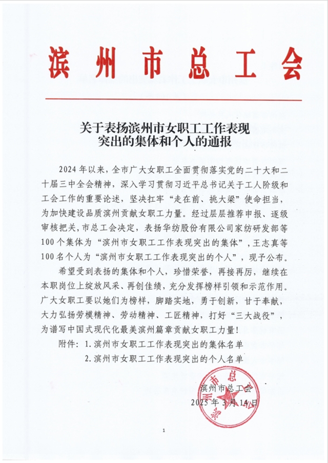 近日,濱州市總工會公布《關于表揚濱州市女職工工作表現突出的集體和個人的通報》文件,家紡研發部憑借卓越的工作表現和突出貢獻,榮獲“濱州市女職工工作表現突出的集體”榮譽稱號。